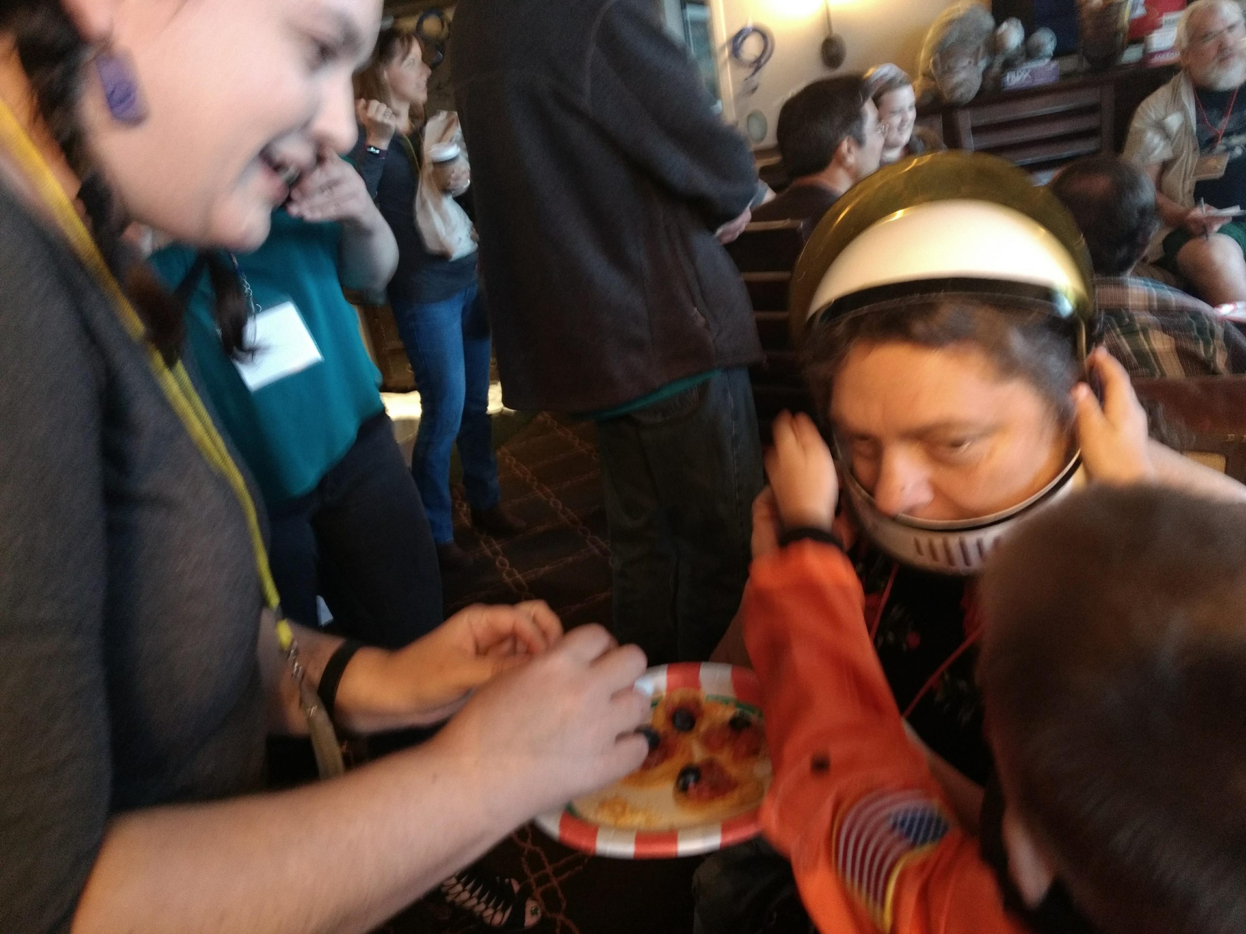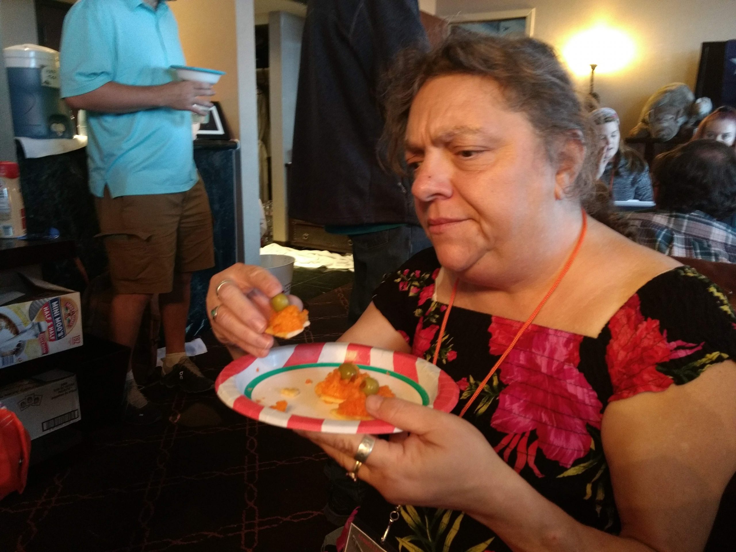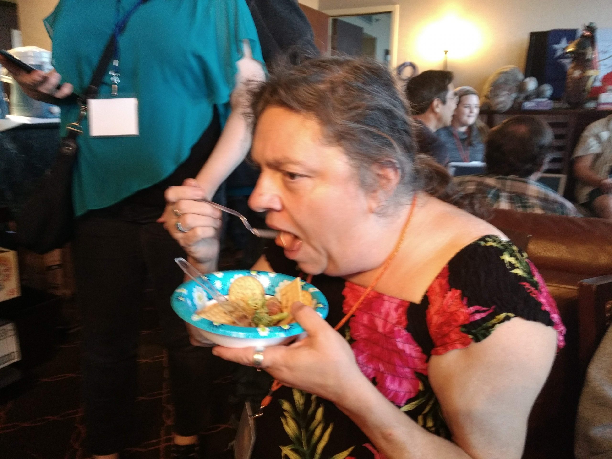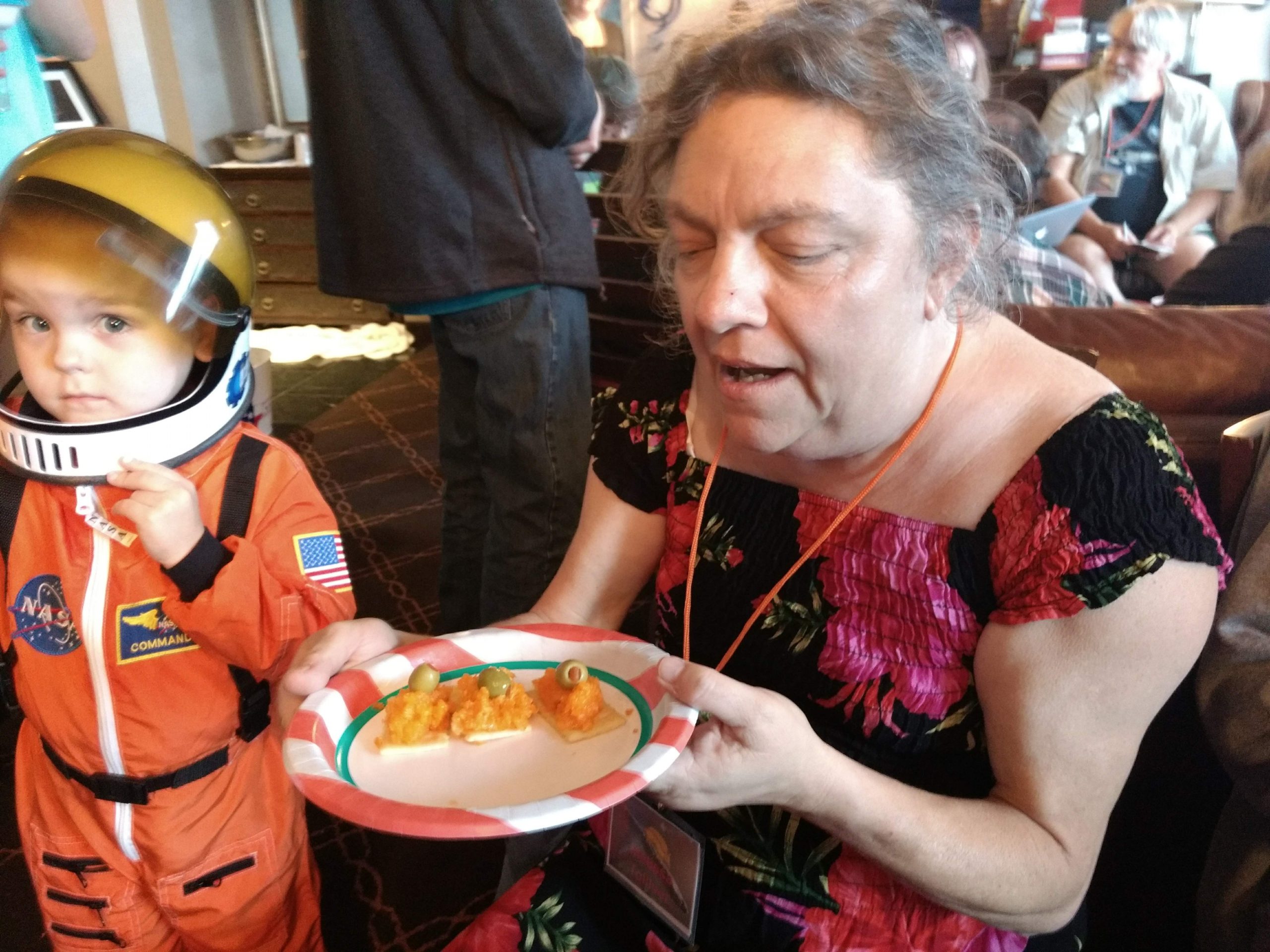 Back when people could eat food together in small, indoor rooms, the erstwhile founders of Space Squid decided it would be fun to make Armadillocon writers create flash fiction stories in five minutes and then judge these creations in a frenzy of shame and laughter. We’ve got some award-winning examples in the next section. But there’s more! Said founders also decided that the chaos was not complete enough with the flash fiction. We needed also to force Dillocon attendees to compete for culinary supremacy using only the ingredients available to them in the con’s hospitality suite. Edible creations (using the adjective loosely) would be crafted in a five-minute timeframe and subjected to the scrutiny of Melissa Tolliver, the hospitality suite impresario and visionary. We present here a collection of photos from the 2018 contest, in which Melissa shows an astonishing range of emotions as she is subjected to the cruelties of the contest: shock, puzzlement, wonderment, disgust, surprise, and even enjoyment. Photos by culinary contest overlord Matthew “Michael Bay” Bey.