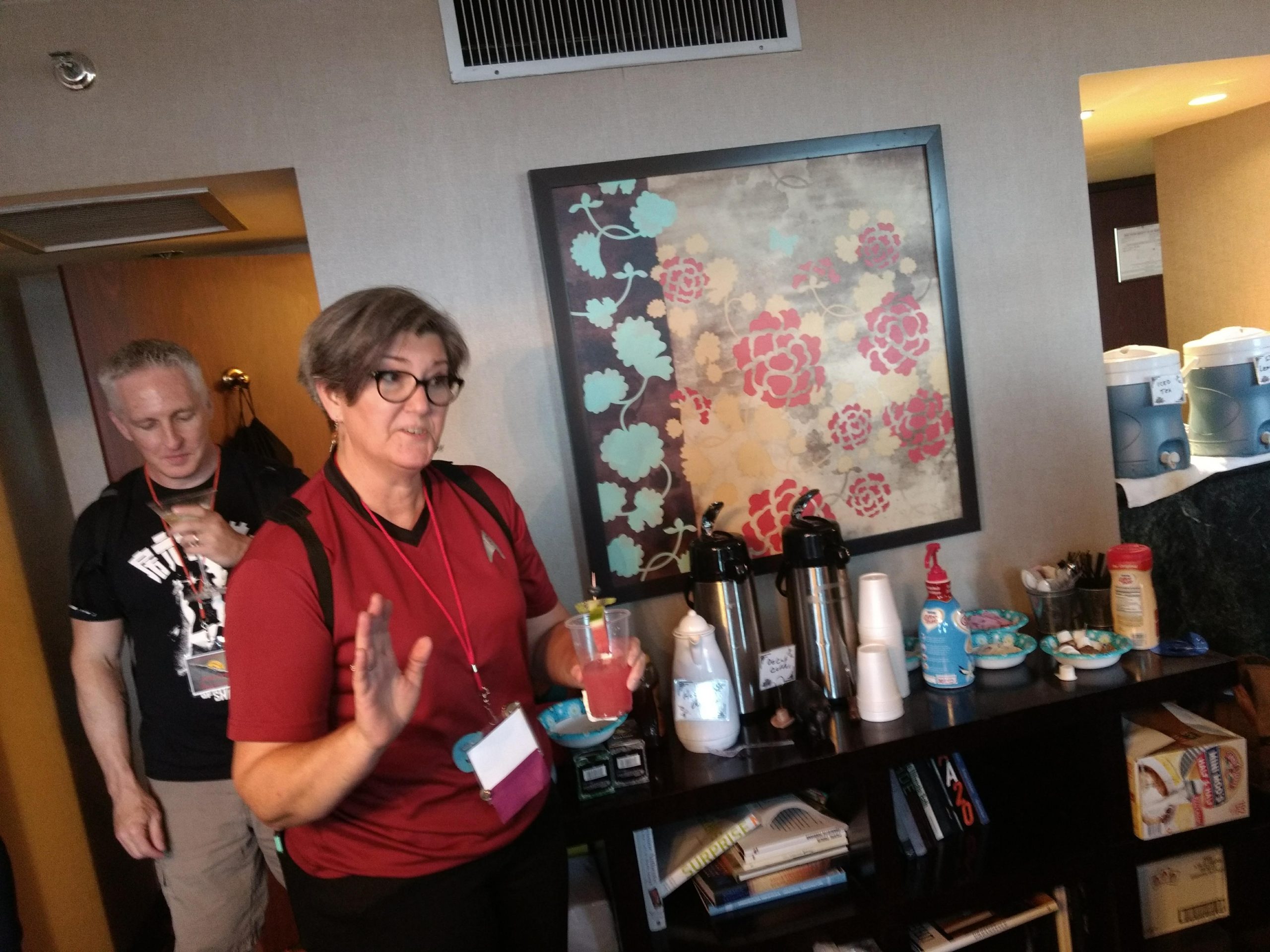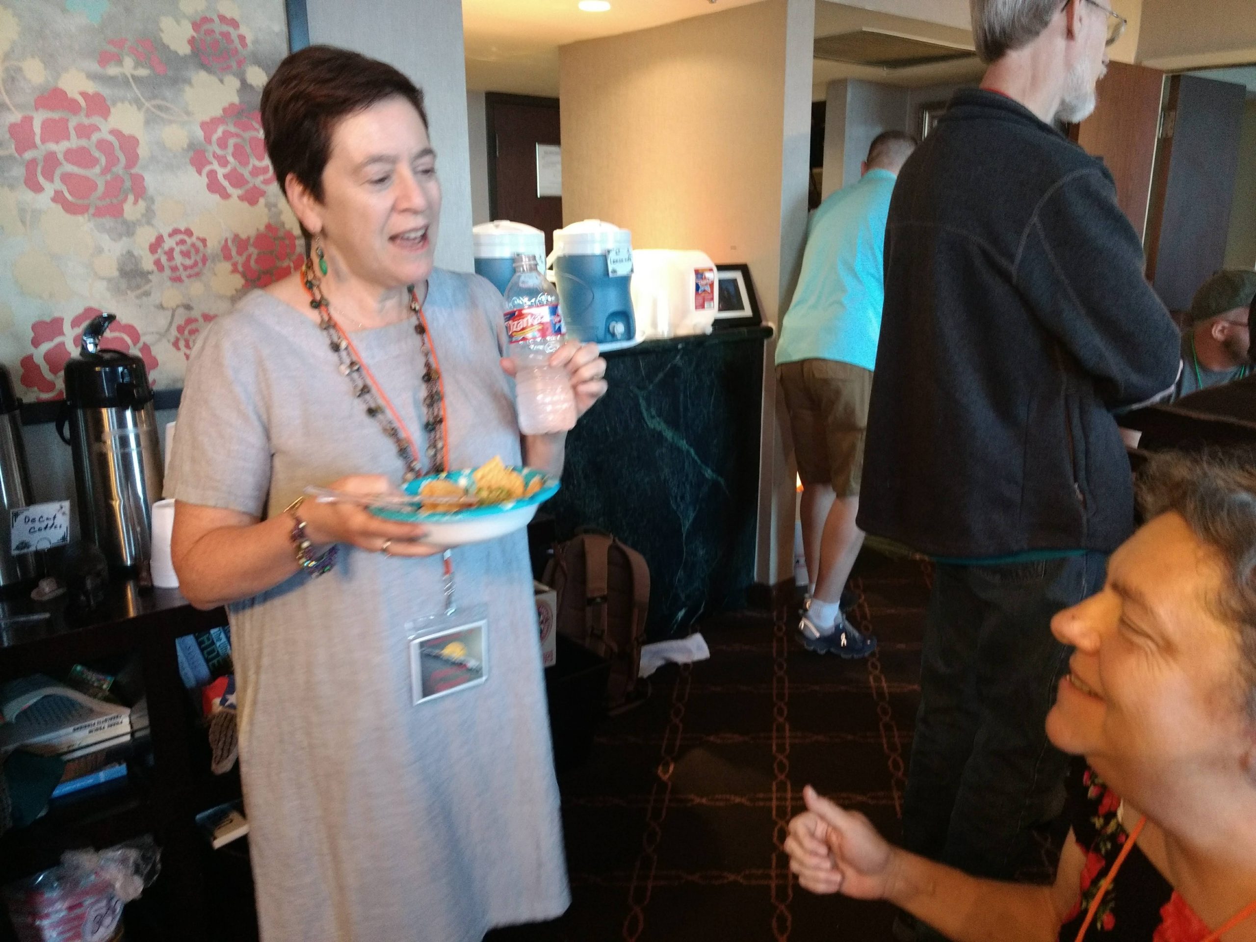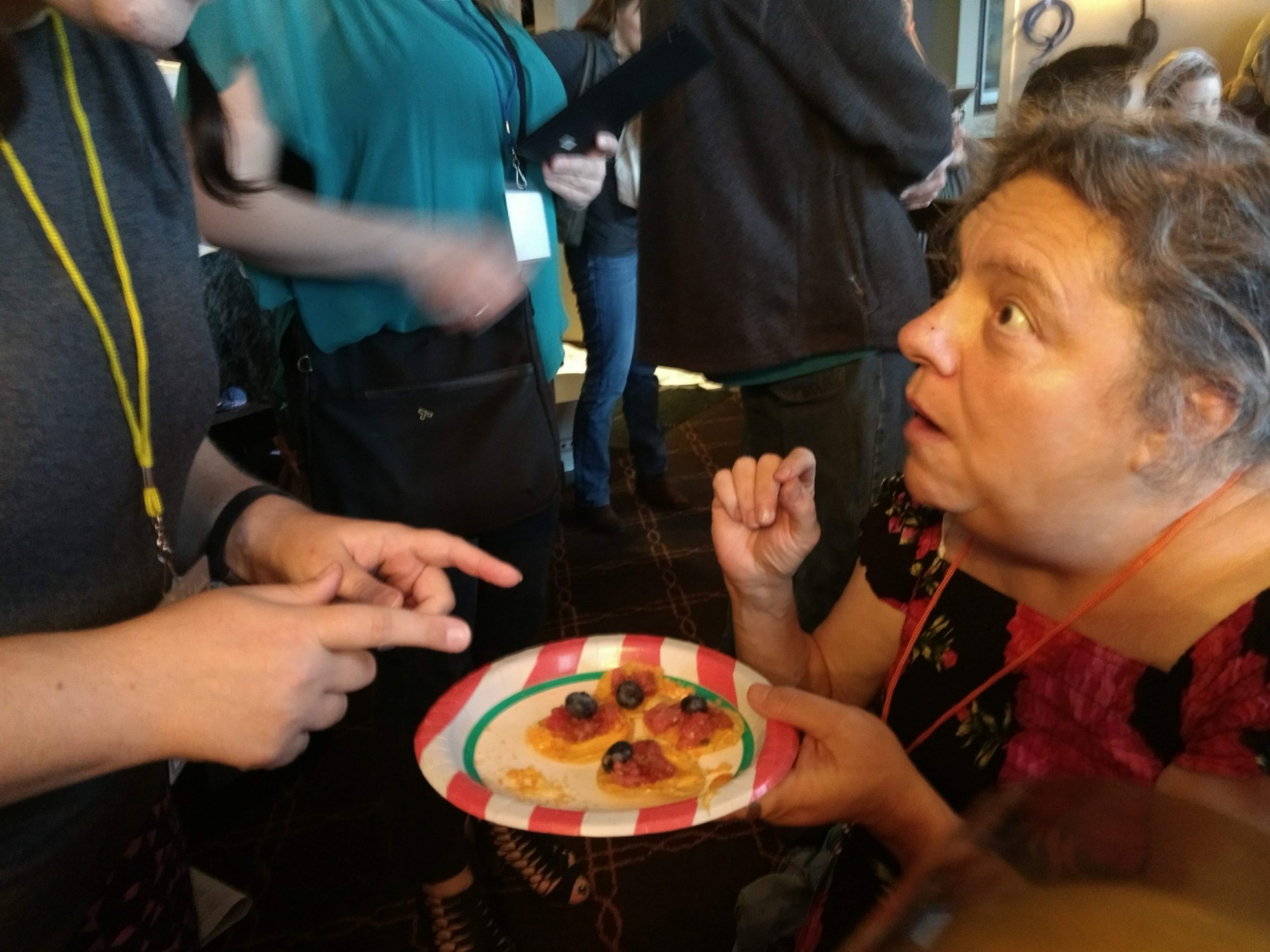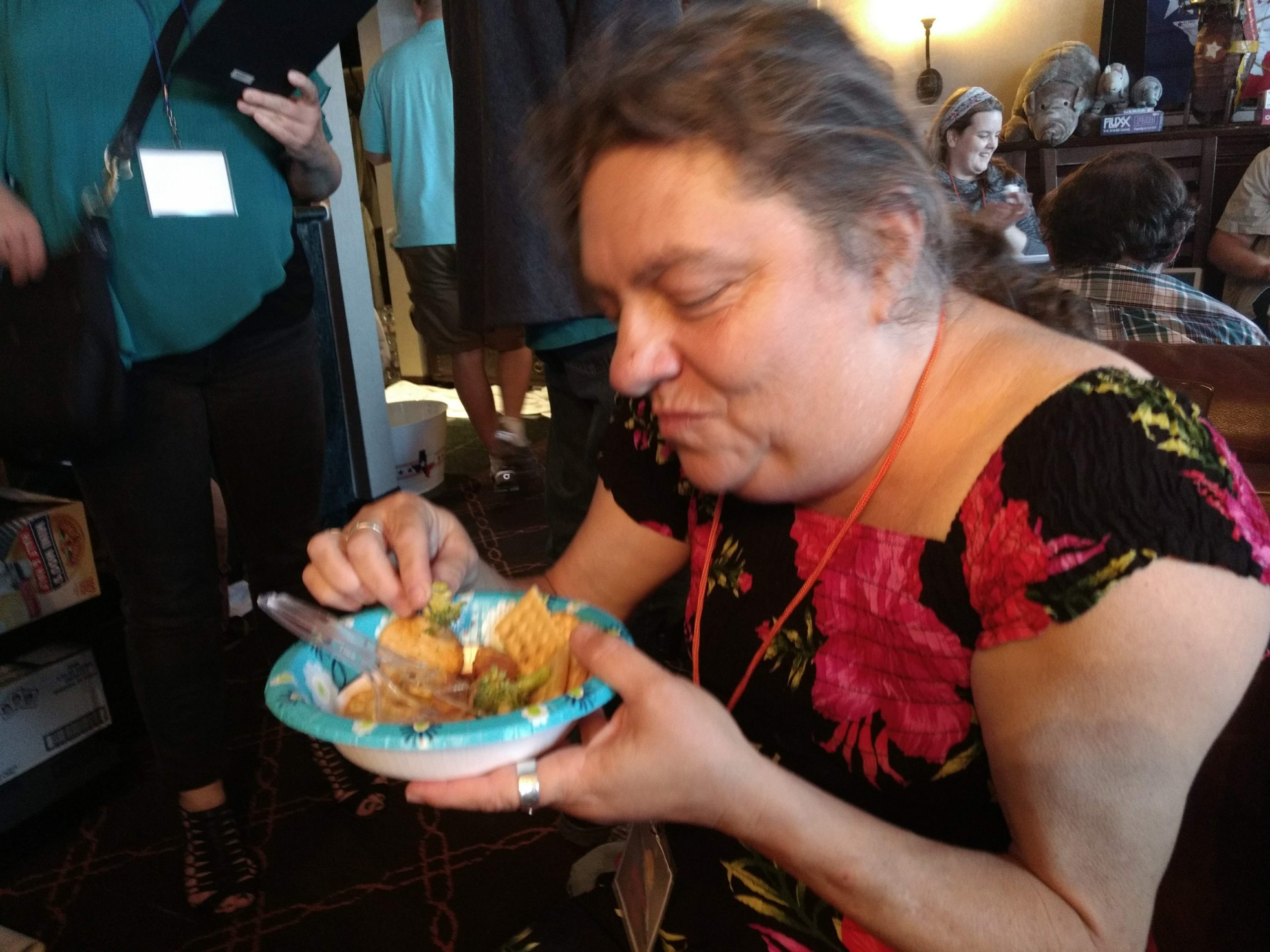 Back when people could eat food together in small, indoor rooms, the erstwhile founders of Space Squid decided it would be fun to make Armadillocon writers create flash fiction stories in five minutes and then judge these creations in a frenzy of shame and laughter. We’ve got some award-winning examples in the next section. But there’s more! Said founders also decided that the chaos was not complete enough with the flash fiction. We needed also to force Dillocon attendees to compete for culinary supremacy using only the ingredients available to them in the con’s hospitality suite. Edible creations (using the adjective loosely) would be crafted in a five-minute timeframe and subjected to the scrutiny of Melissa Tolliver, the hospitality suite impresario and visionary. We present here a collection of photos from the 2018 contest, in which Melissa shows an astonishing range of emotions as she is subjected to the cruelties of the contest: shock, puzzlement, wonderment, disgust, surprise, and even enjoyment. Photos by culinary contest overlord Matthew “Michael Bay” Bey.